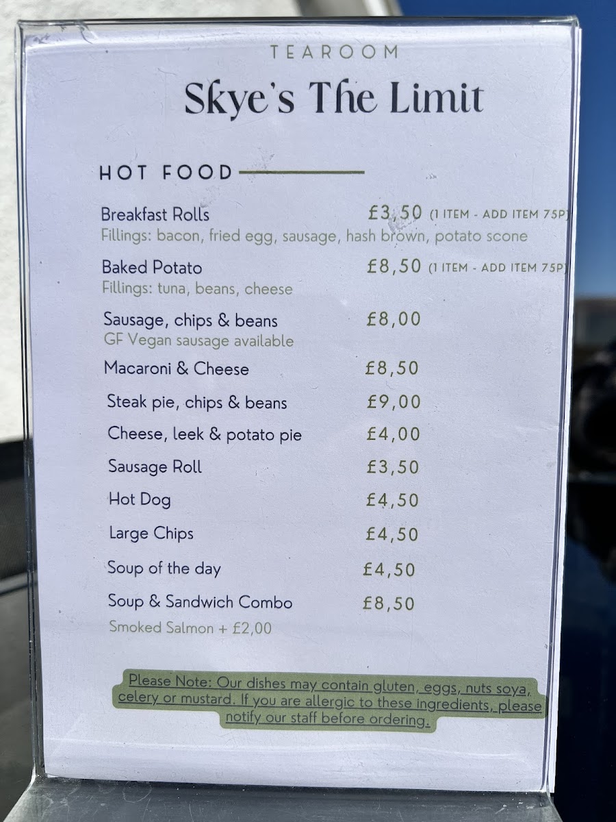 With limited indoor seating, Skye's the Limit offers an excellent take-away service, perfect for those exploring the scenic routes around Skye. Whether you're waiting for a ferry or simply taking a break from sightseeing, this cafe is a fantastic pit stop filled with flavor, warmth, and genuine hospitality.